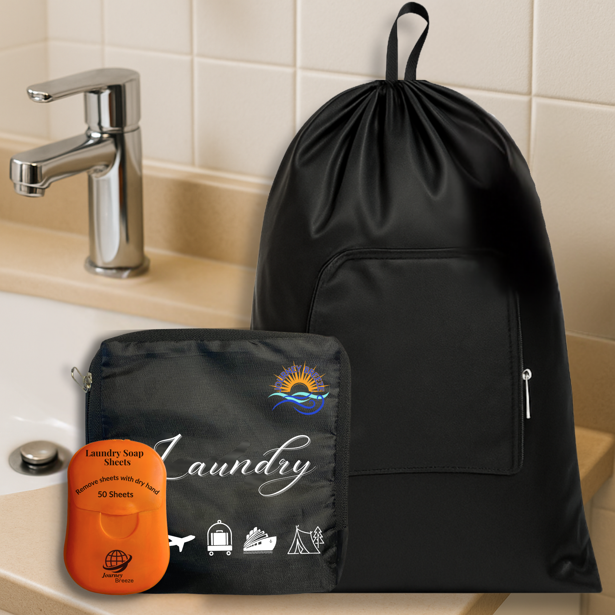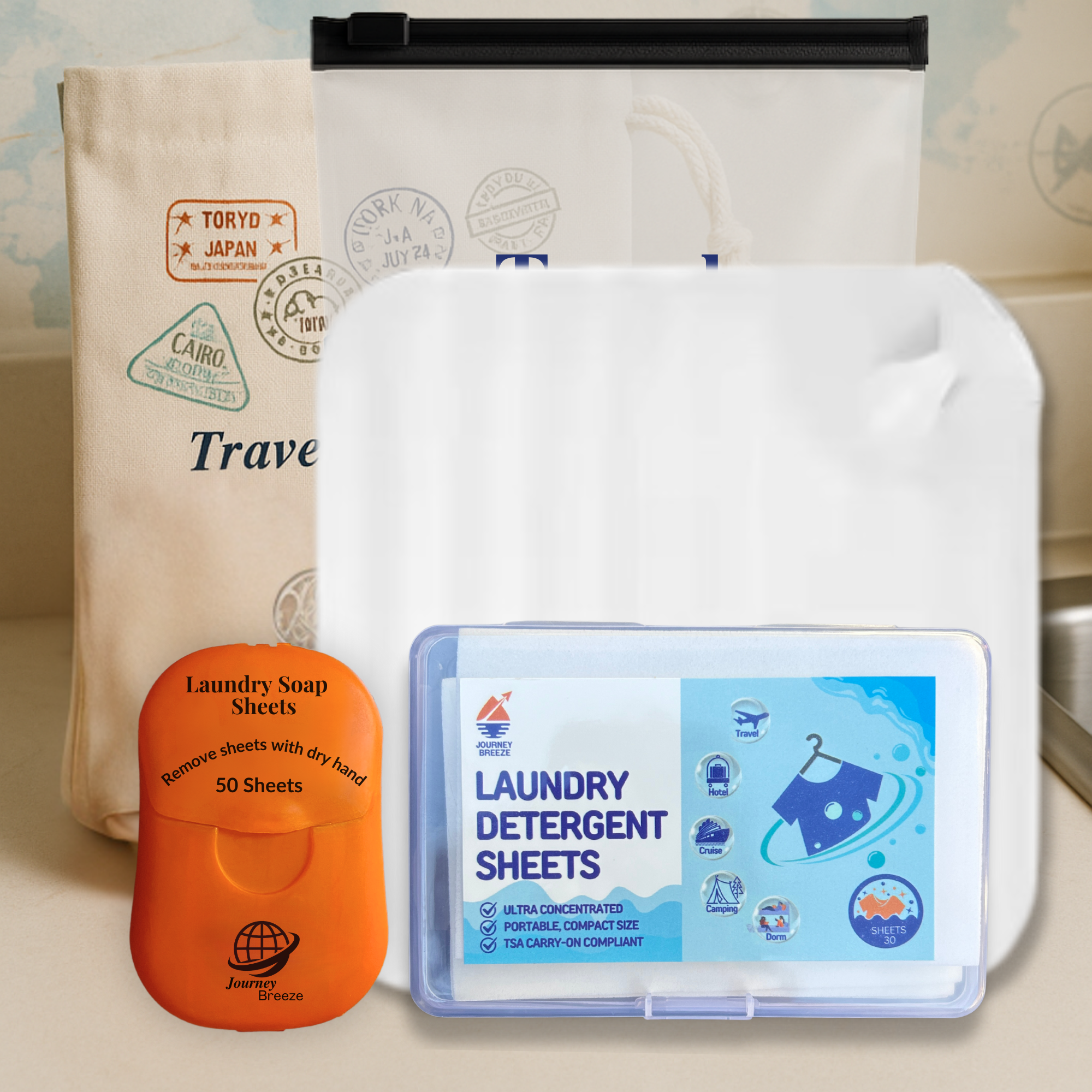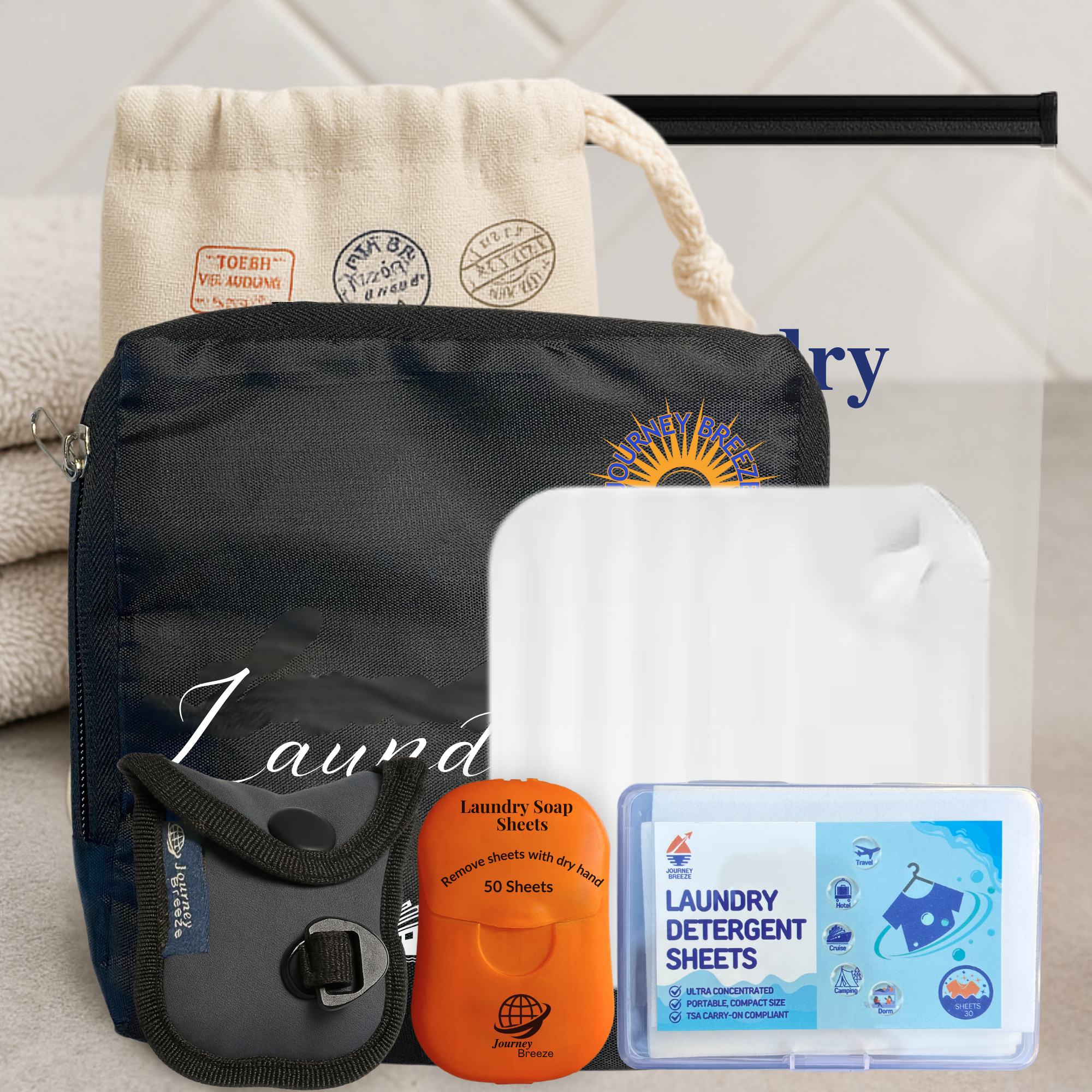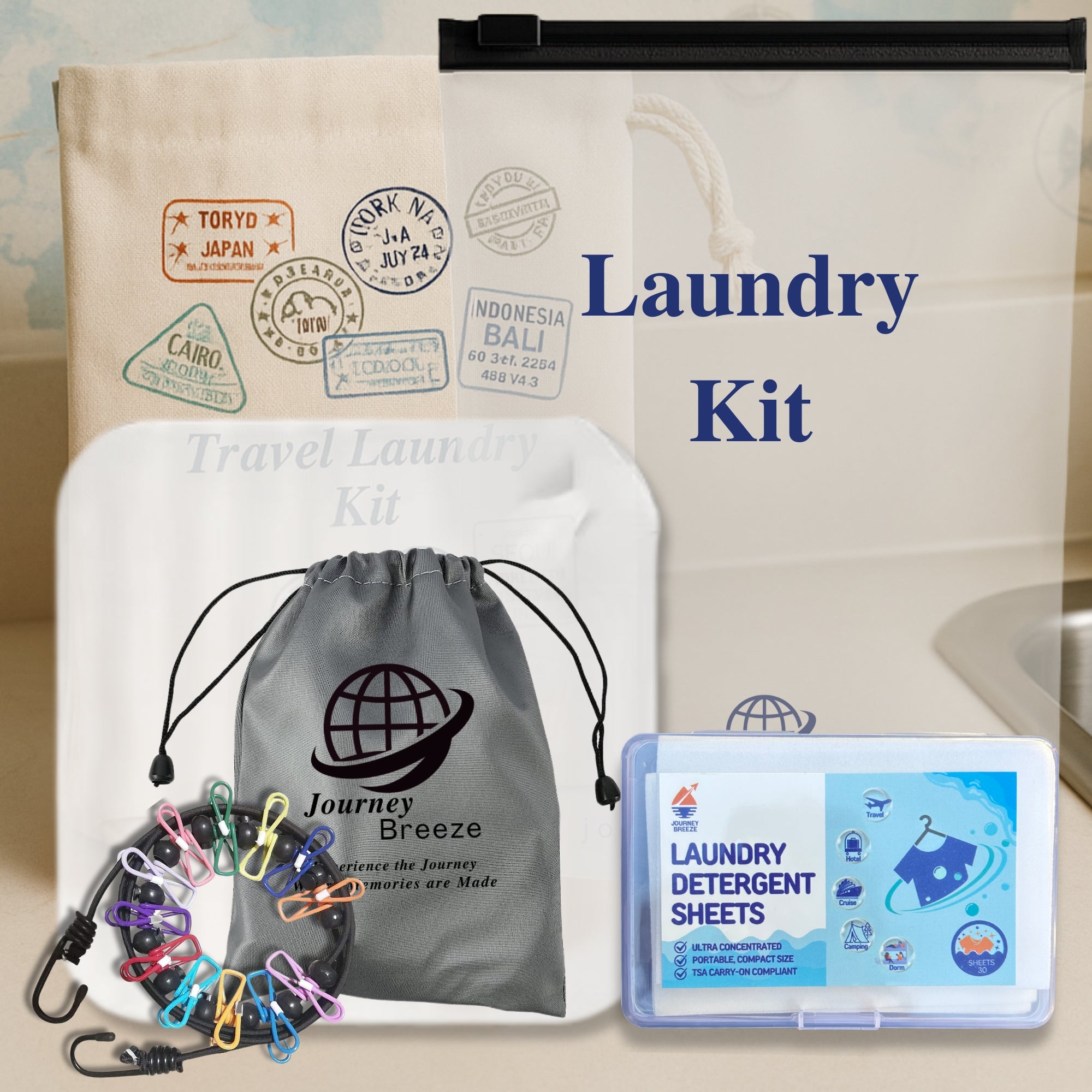 Travel Laundry Kit – 5-Piece Includes 2 Sizes of Detergent Sheets, Sink Stopper, Clothesline, Laundry Bag, Canvas Storage Bag and Zipper Pouch - TSA Compliant, Mess-Free