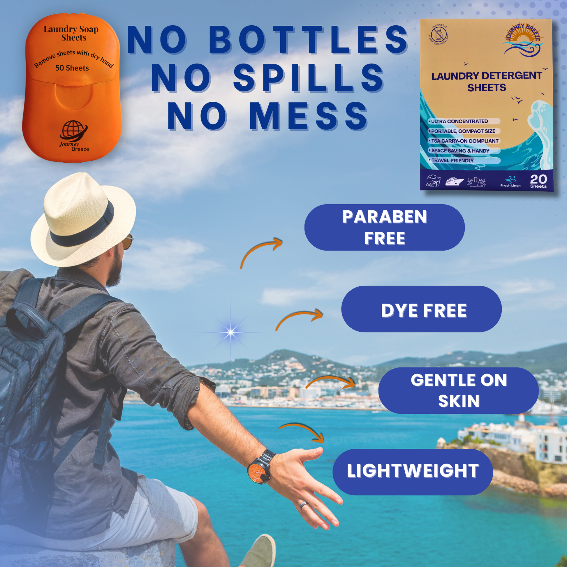 - The 50-sheet pack includes a portable drawstring bag and is perfect for sink laundry while traveling. These detergent sheets dissolve instantly, eliminating the need for scoops or measuring. Ideal for washing clothes in hotel rooms, airports, or hostels, they offer a cleaner, more convenient alternative to traditional travel detergent packets.