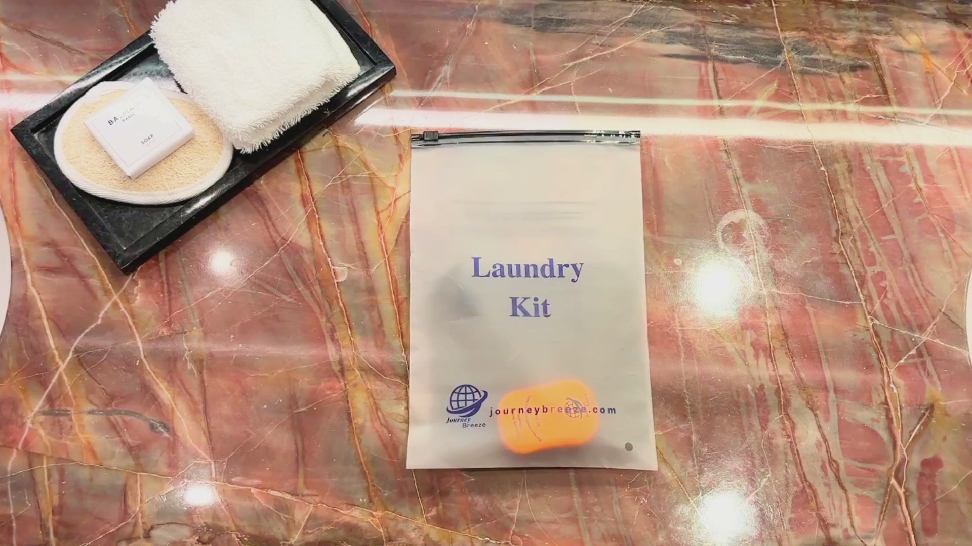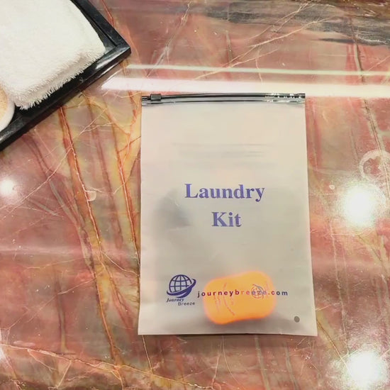 The Journey Breeze Travel Laundry Kit includes lightweight detergent sheets, a flexible sink stopper, and a reusable frosted zip pouch—perfect for hotels, cruises, camping, and carry-on travel.